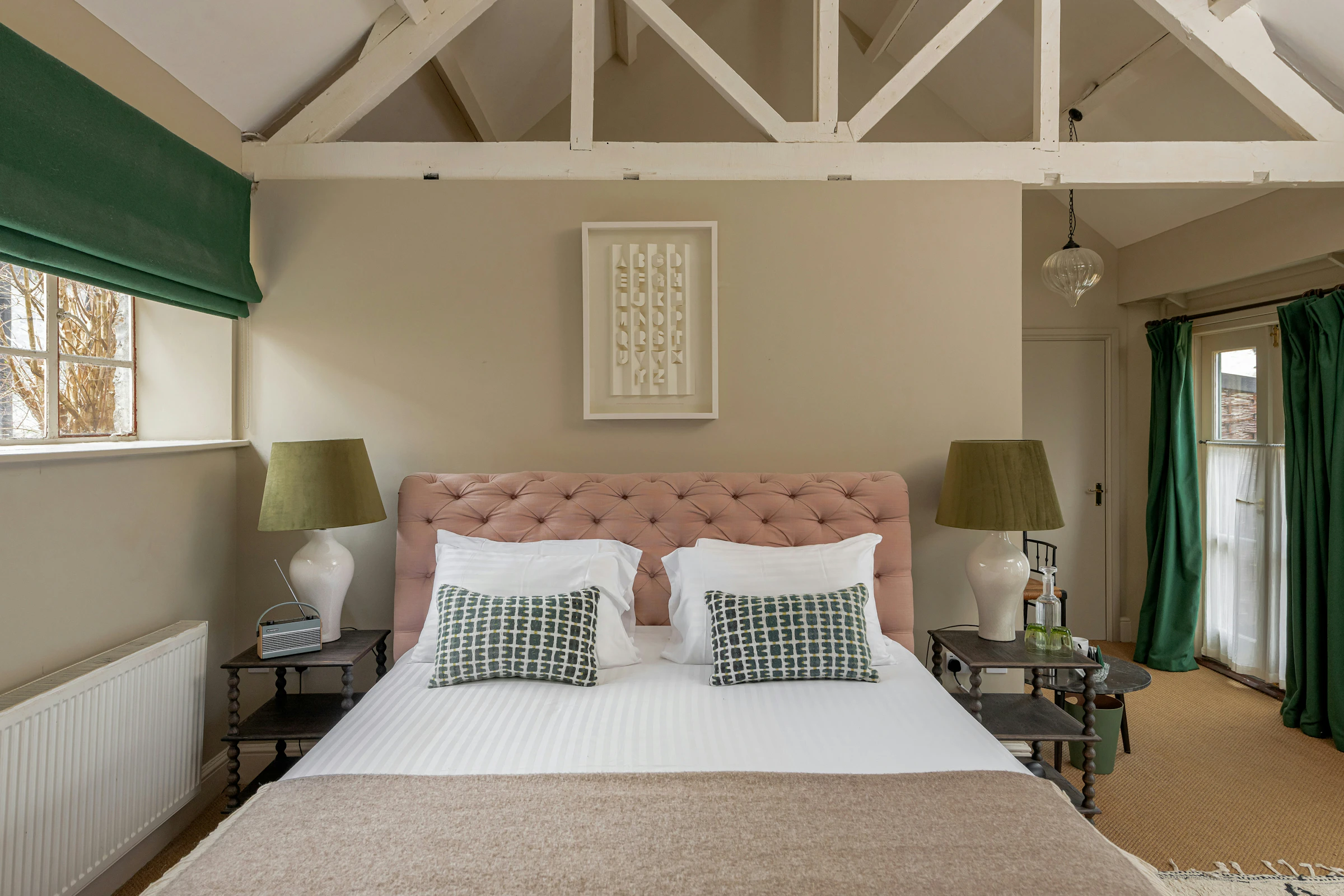 This is a large room separate to the main house in our stable block, with high ceilings and original beams, a super king-sized bed and a lovely private bathroom with walk-in shower.