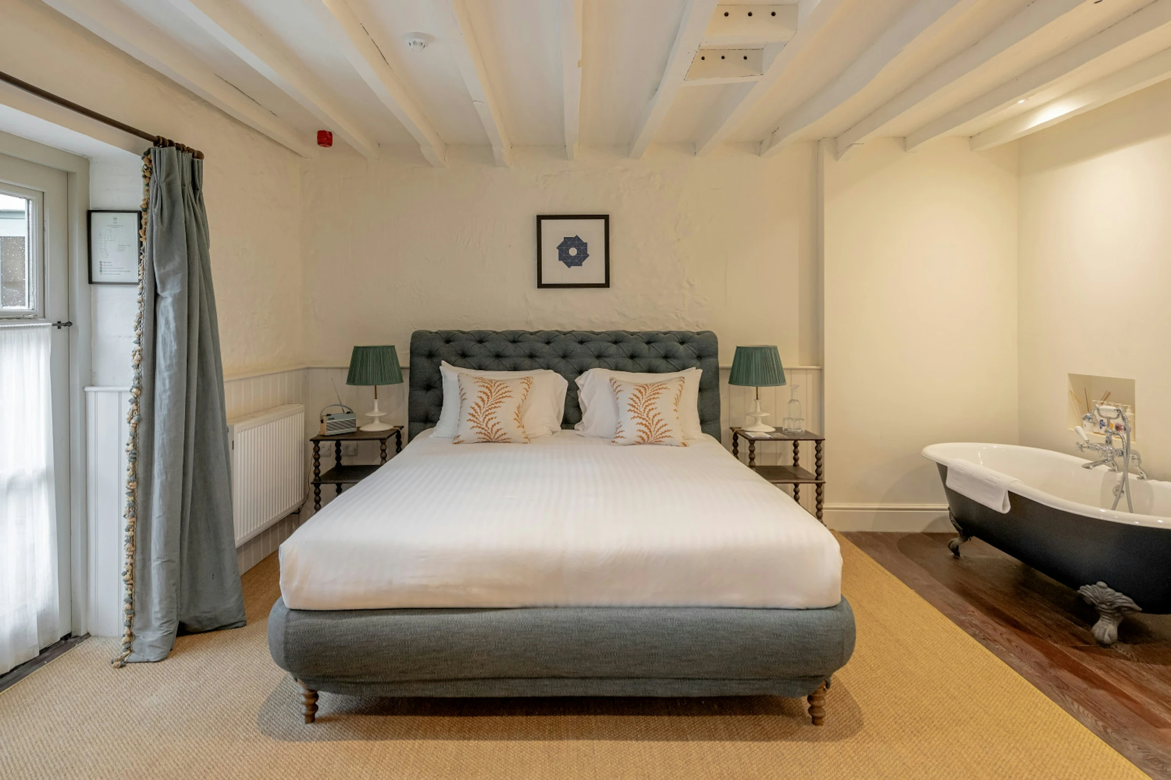 This large double room is located in the main house above the bar, with views out of the front of the building and village beyond. Room 1 has a super king-sized bed, and a spacious bathroom with a freestanding bath and walk-in shower.