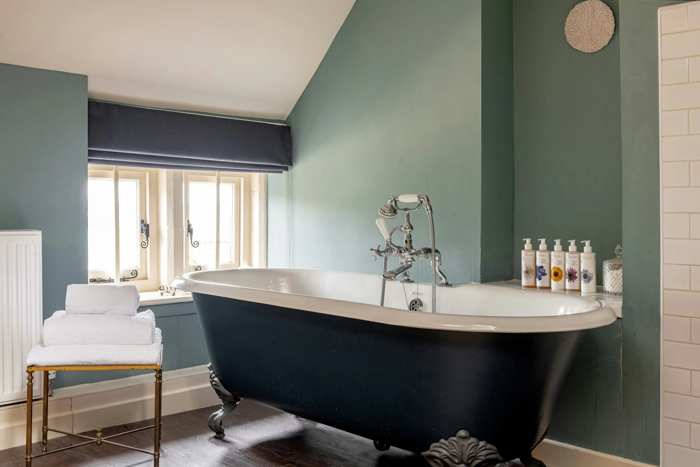 One of our larger rooms on the attic floor, room 7 has a super king-sized bed, and a large bathroom with a freestanding bath. The bedroom has quite low ceilings and a very low door height into the bathroom. Guests that are blessed with height may wish to opt for another room. There is also a small day bed in this room.